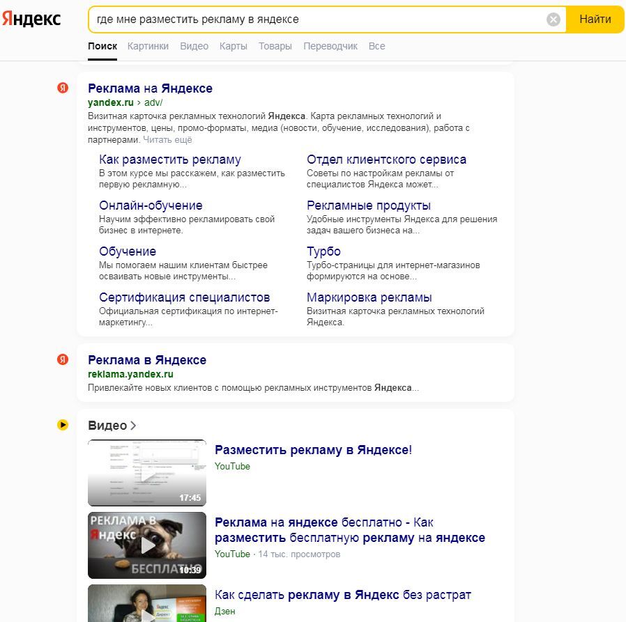 Реклама в Яндексе может направить потенциального клиента и на Ваш сайт, страницы в социальных сетях, на мультиссылочник. Покажет порталы объявлений с аналогичными предложениями услуг и товаров, где, конечно же, должны быть размещены и Ваши предложения. Предложит посмотреть на других сервисах Яндекса: Бизнес, Видео, Карты, Картинки, Услуги.